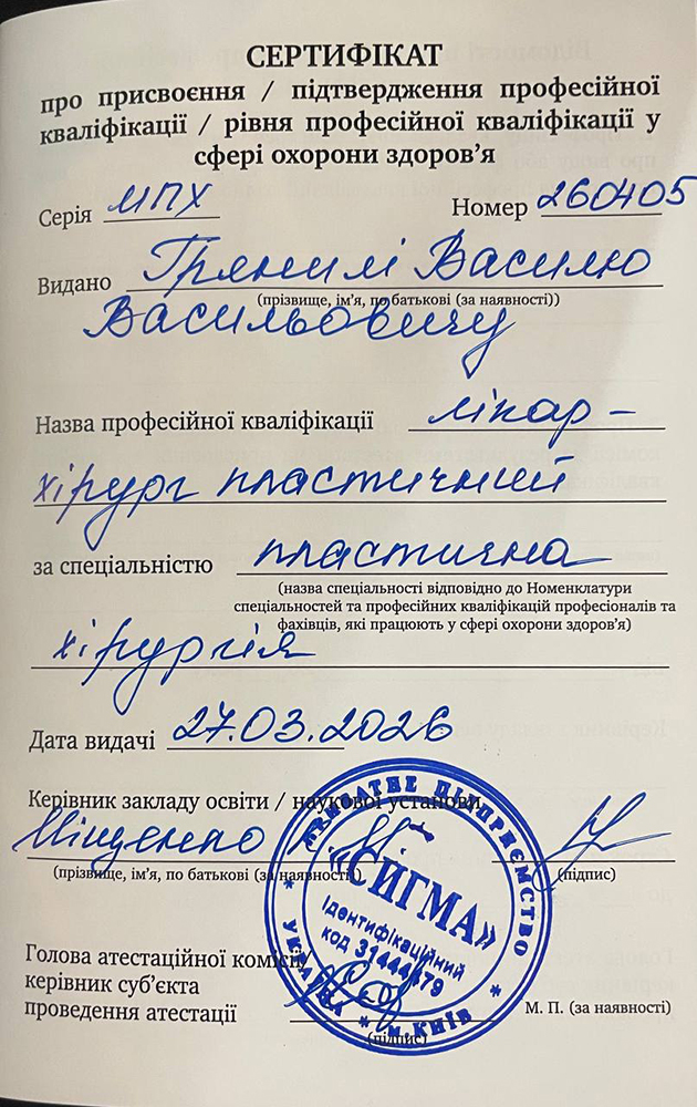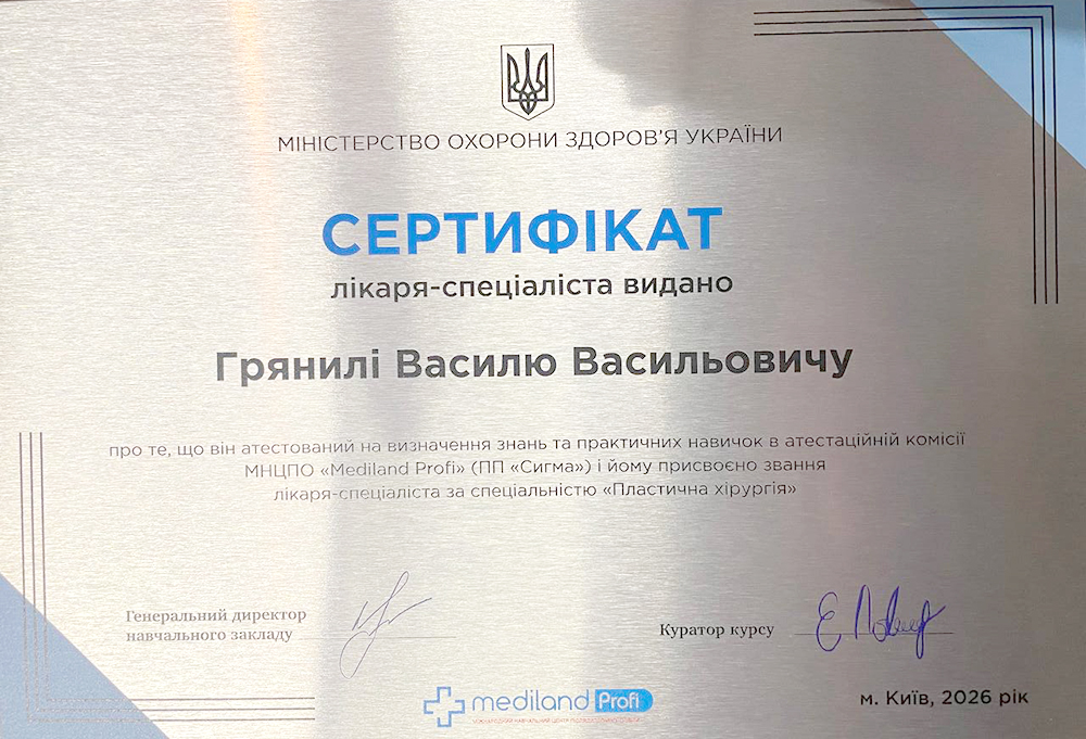 - 2026 рік - спеціальність "Пластична хірургія" (МНЦПО "Mediland Profi" (ПП "Сигма")).