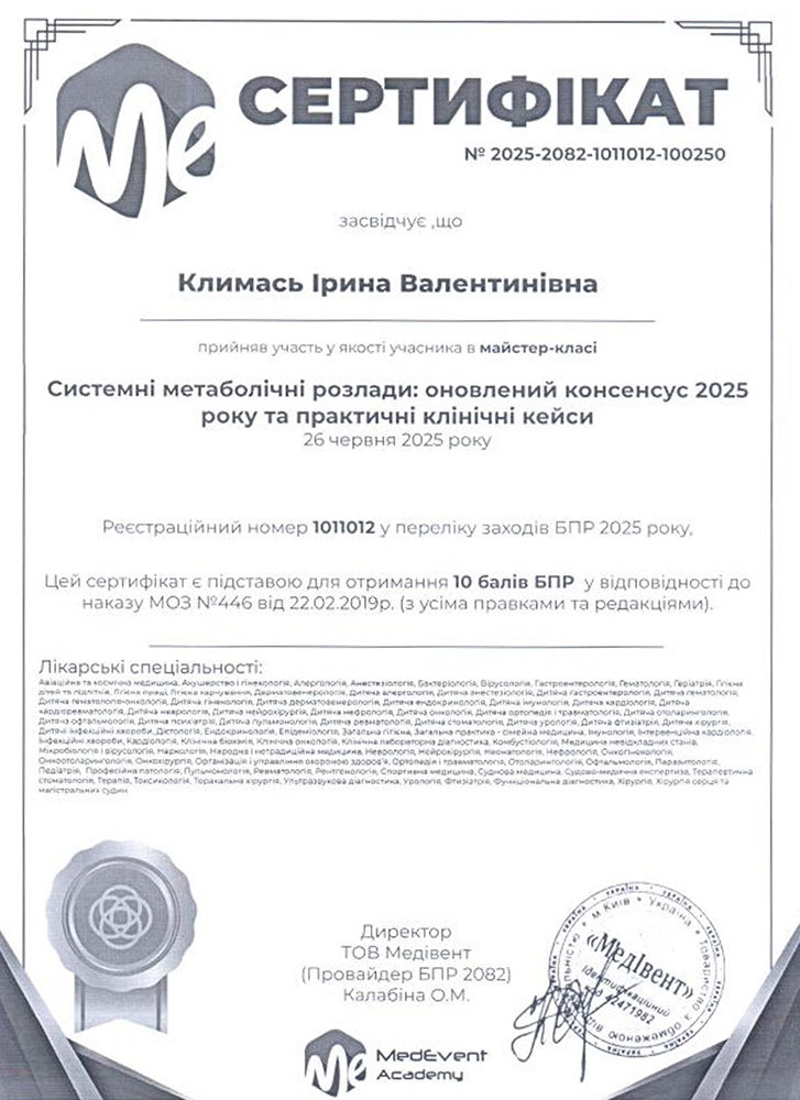 - 2024 рік - ТУ "Актуальні питання ревматології" (Національний університет охорони здоров’я України імені П.Л. Шупика).