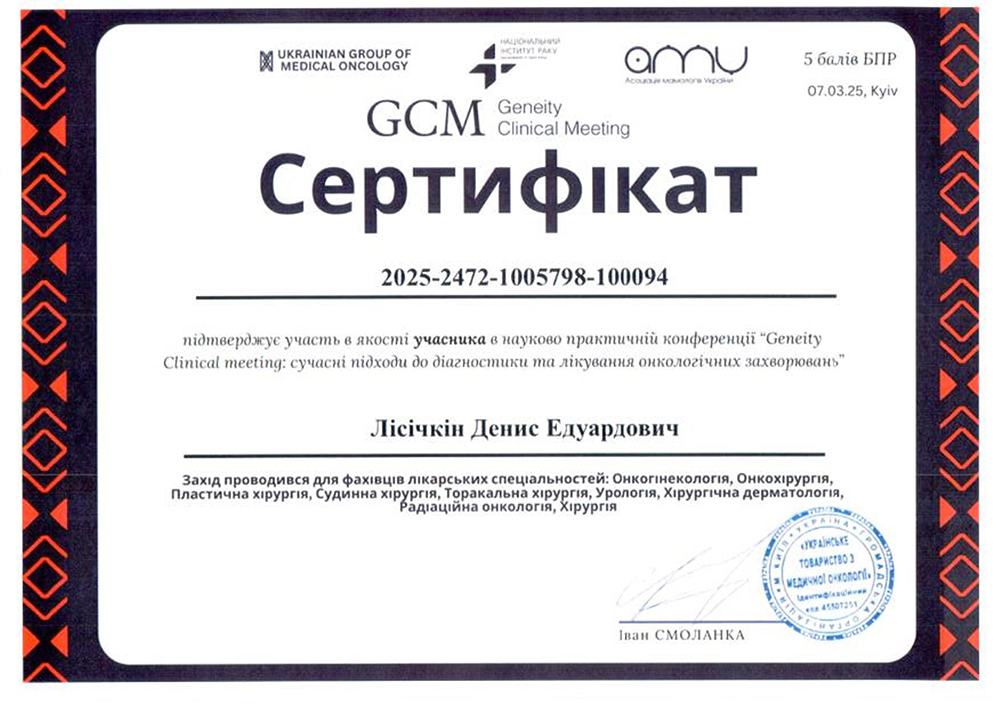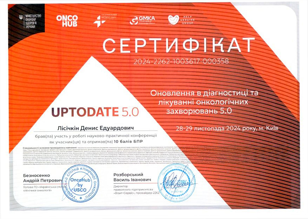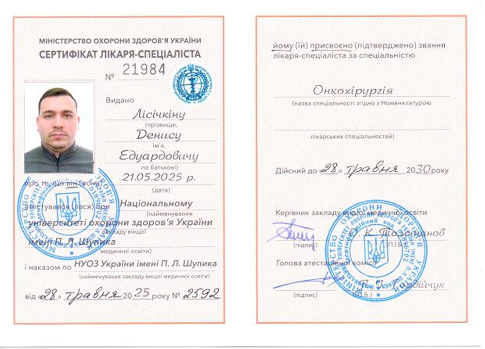 - 2025 рік - отримав спеціальність "Лікар-онкохірург" (Національний університет охорони здоров'я ім. П.Л. Шупика).