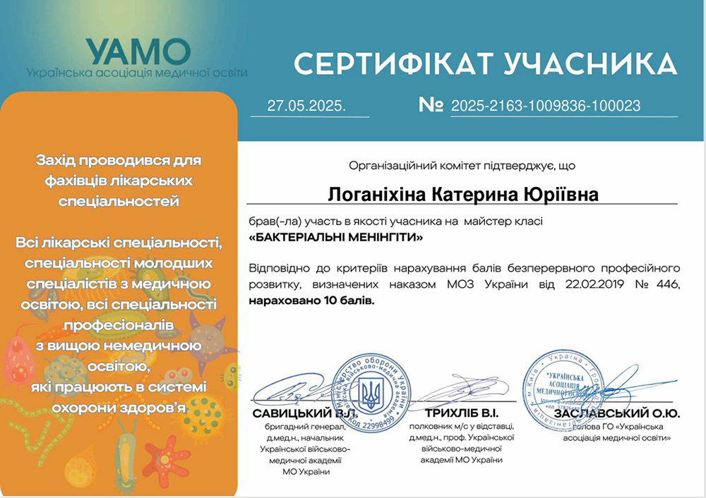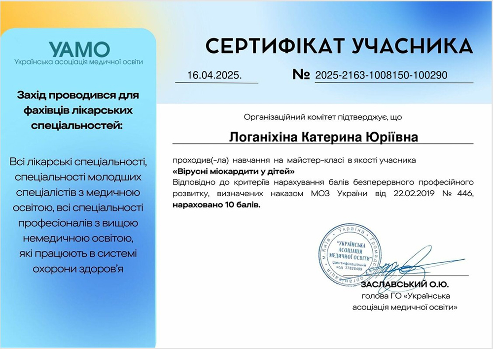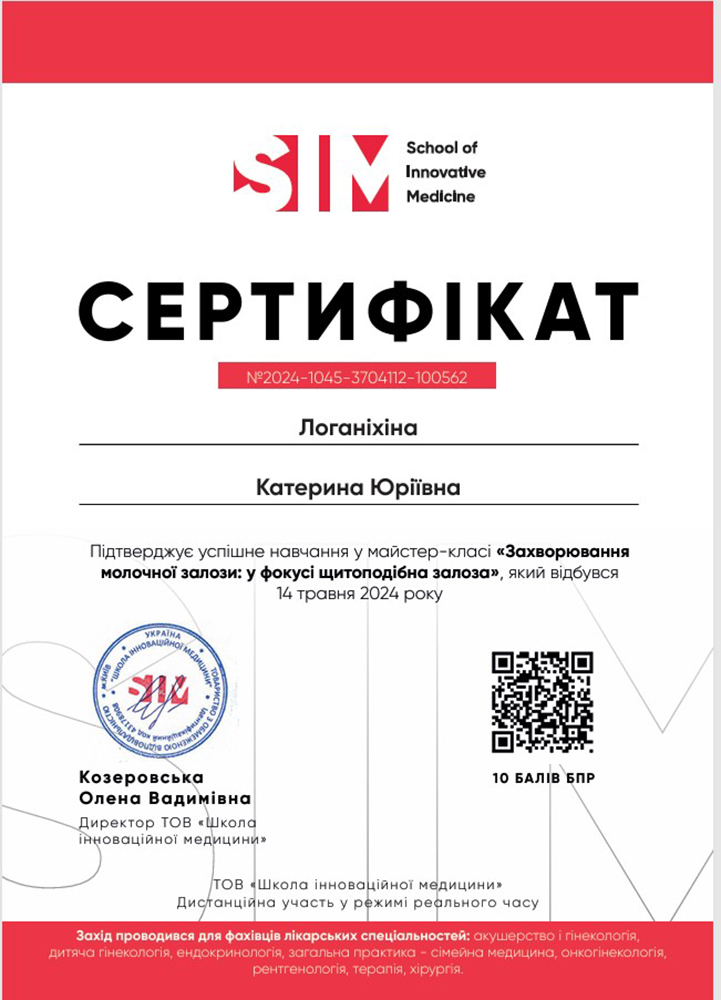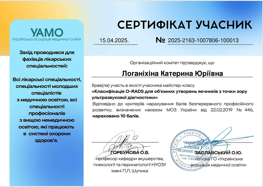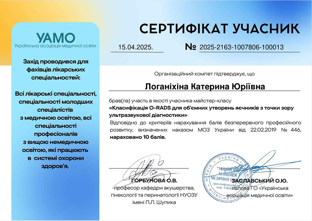 - 2013 рік - спеціалізація за фахом "Радіологія" (НМАПО ім. П.Л. Шупика).