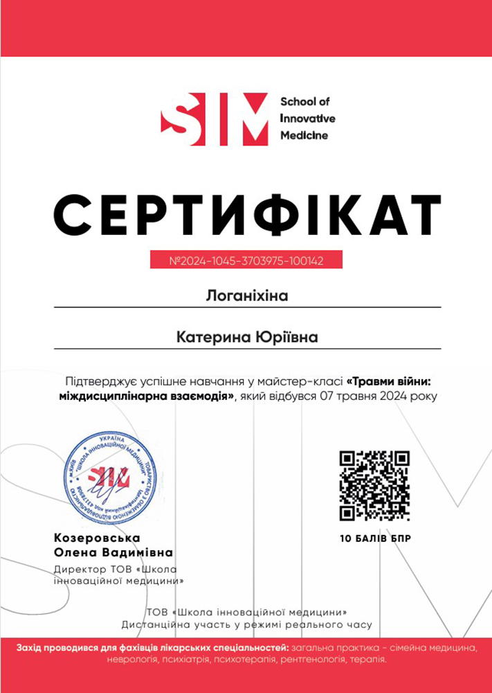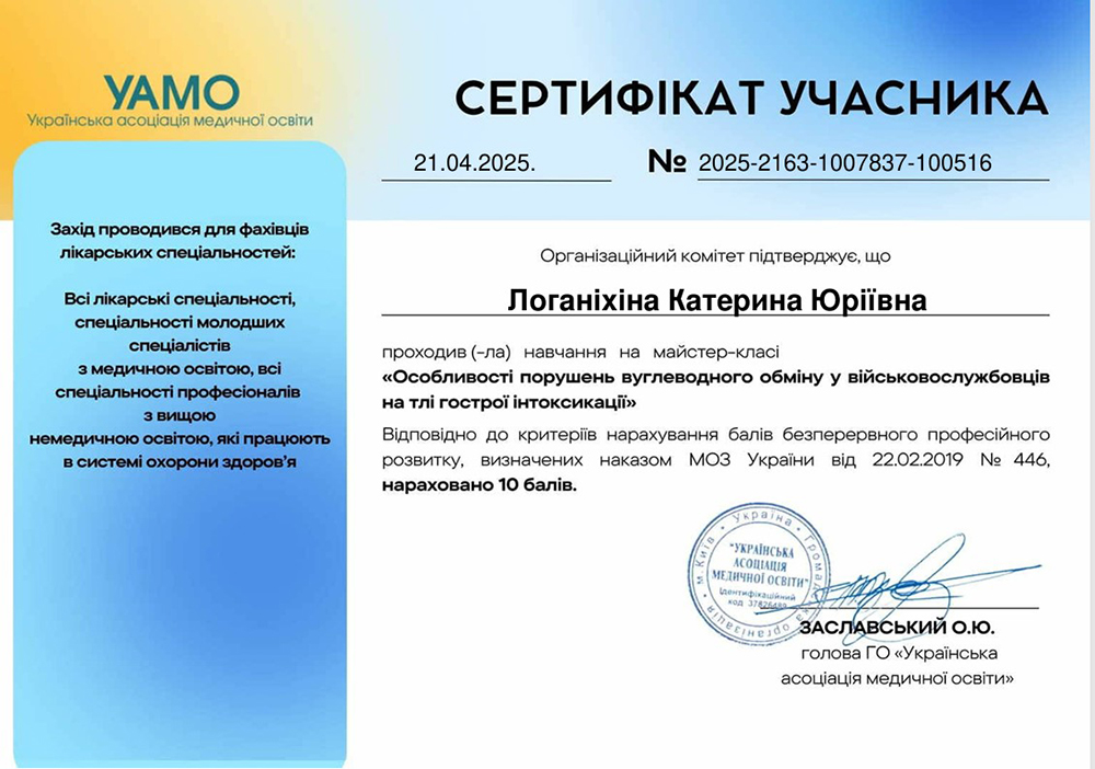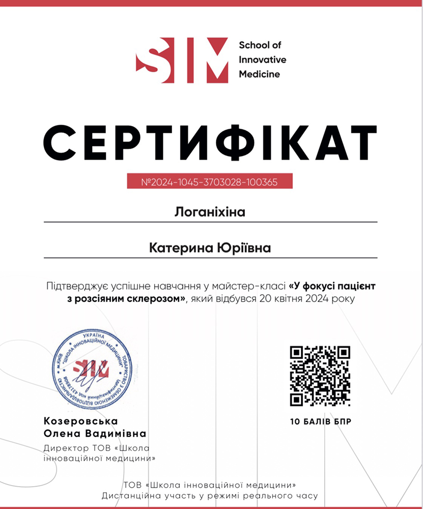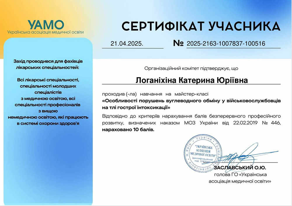 - 2013 рік - спеціалізація за фахом "Радіологія" (НМАПО ім. П.Л. Шупика).