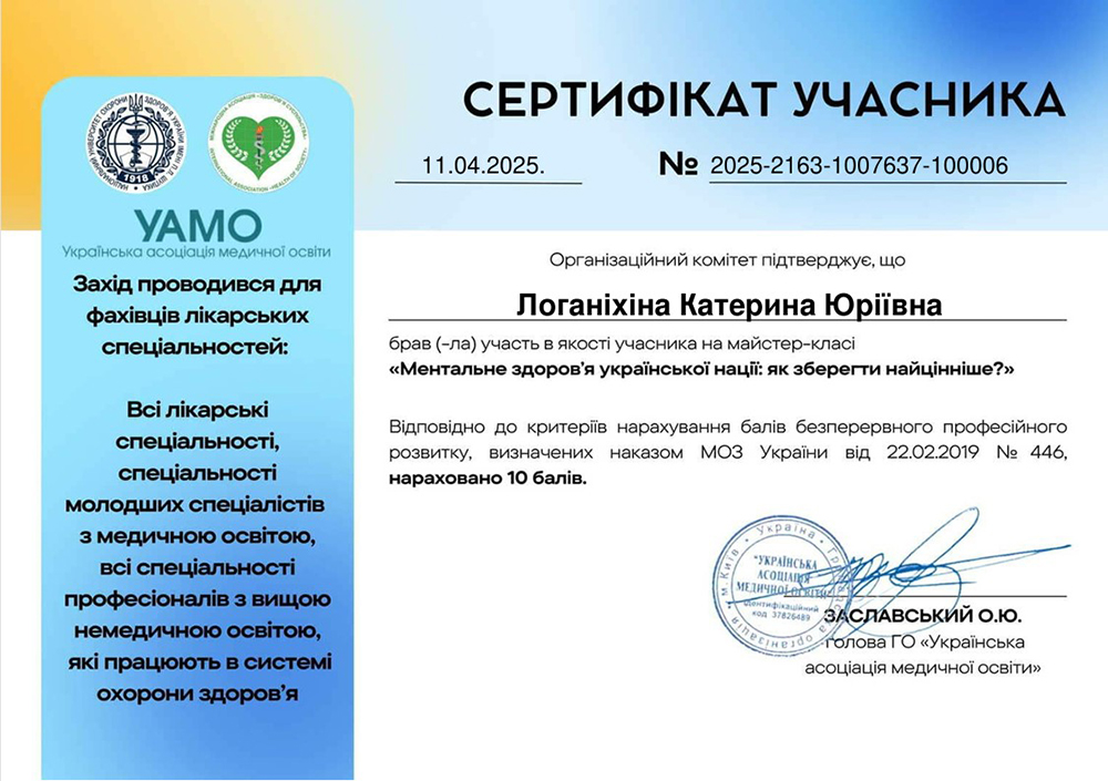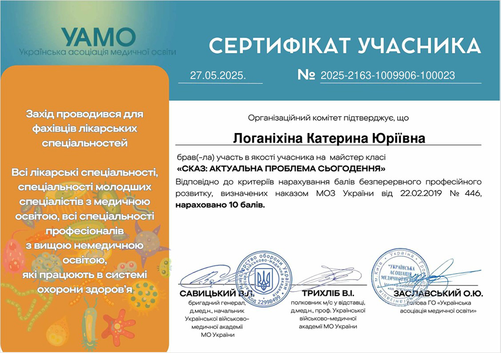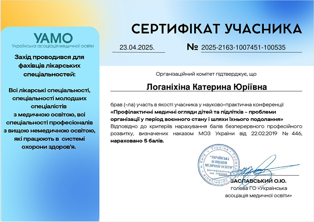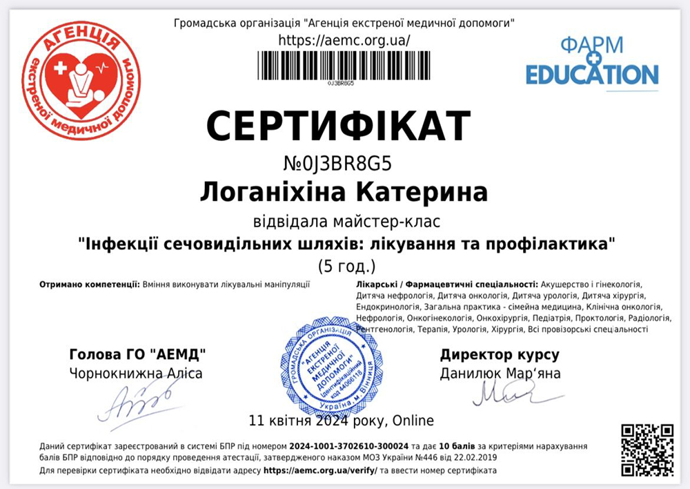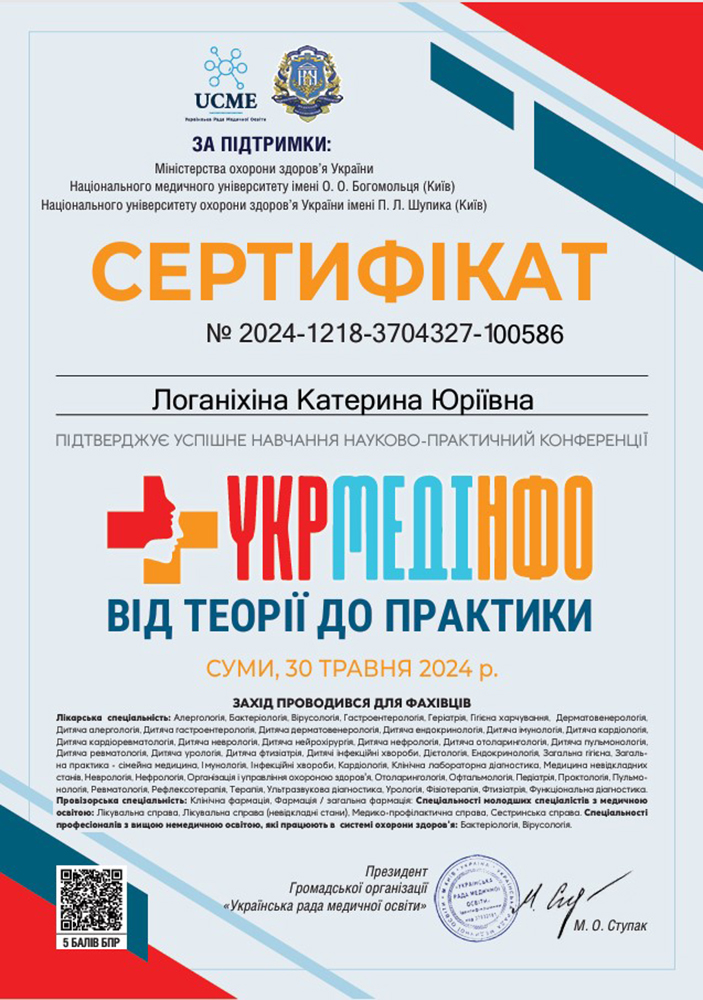 - 2014 рік - кандидат медичних наук (Національна медична академія післядипломної освіти ім. П.Л. Шупика).