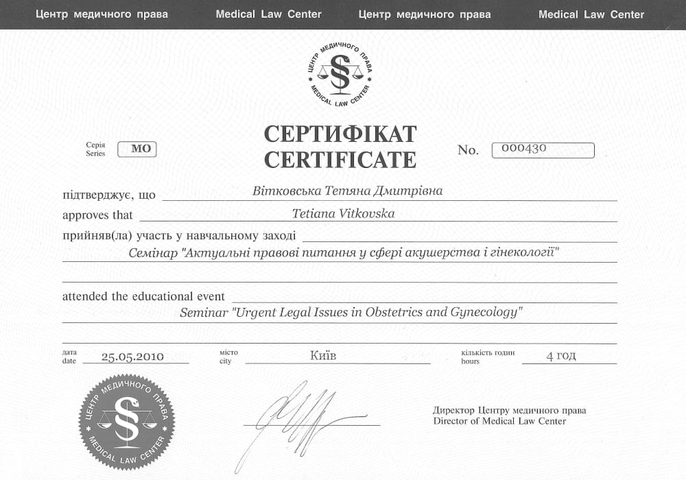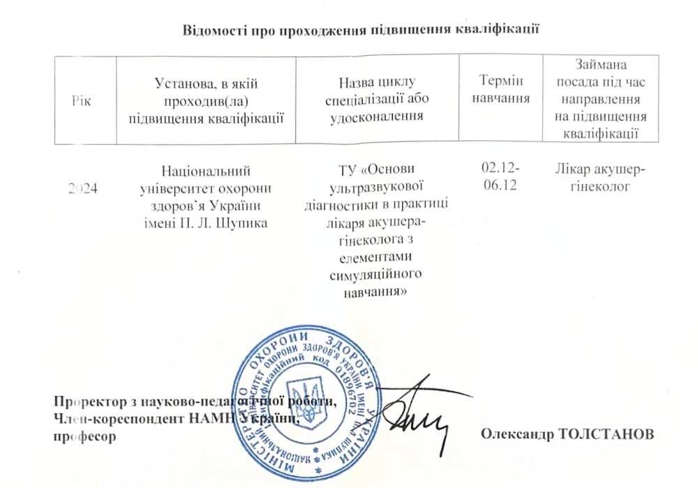 - 2019 рік - отримала вищу категорію з "Акушерства і гінекології" при Управлінні охорони здоров'я Сумської облдержадміністрації.