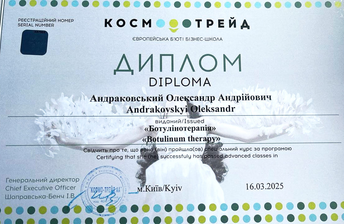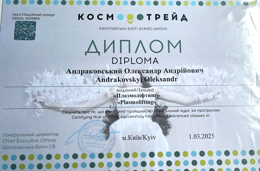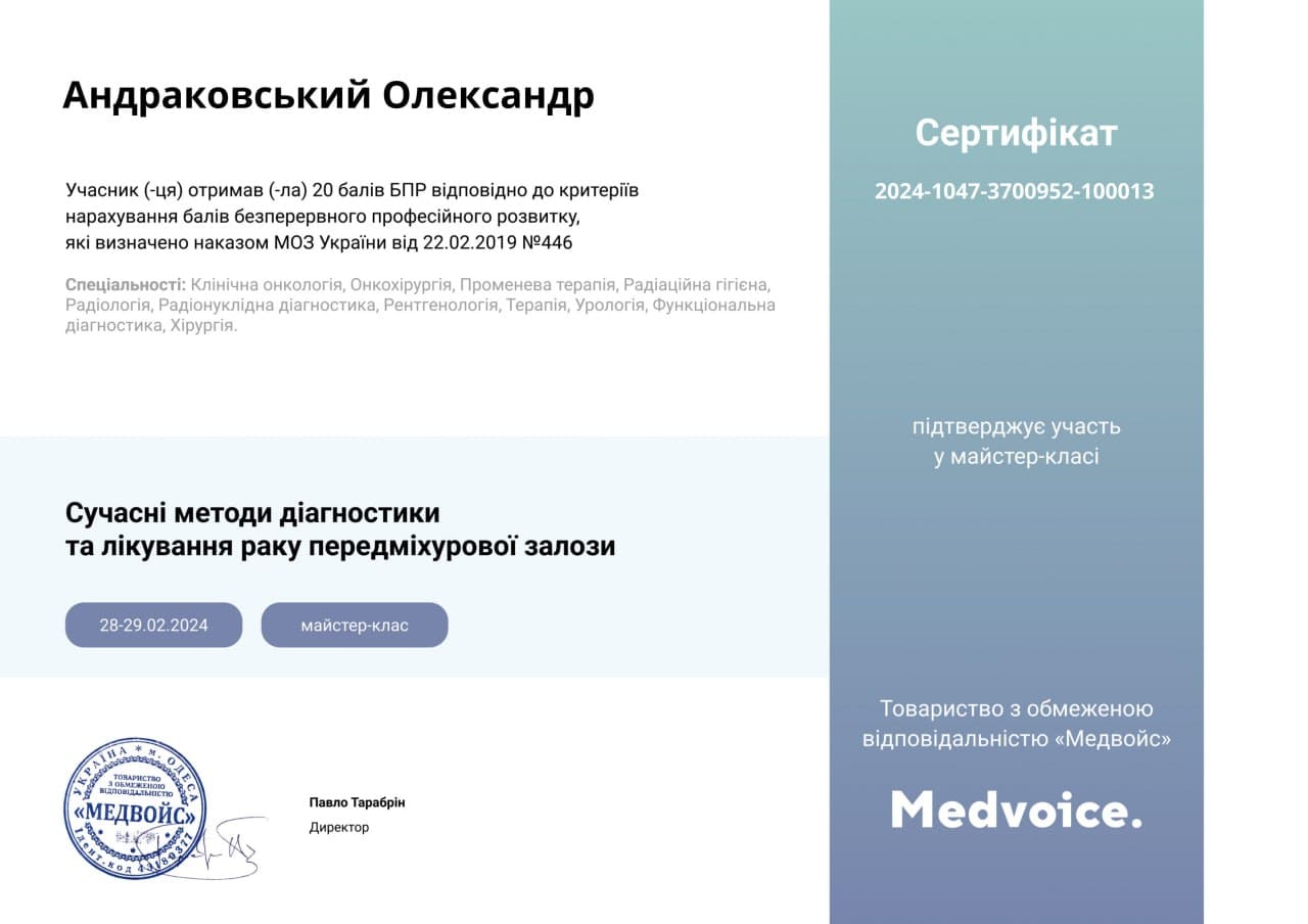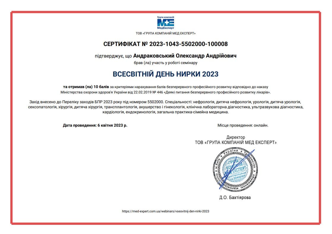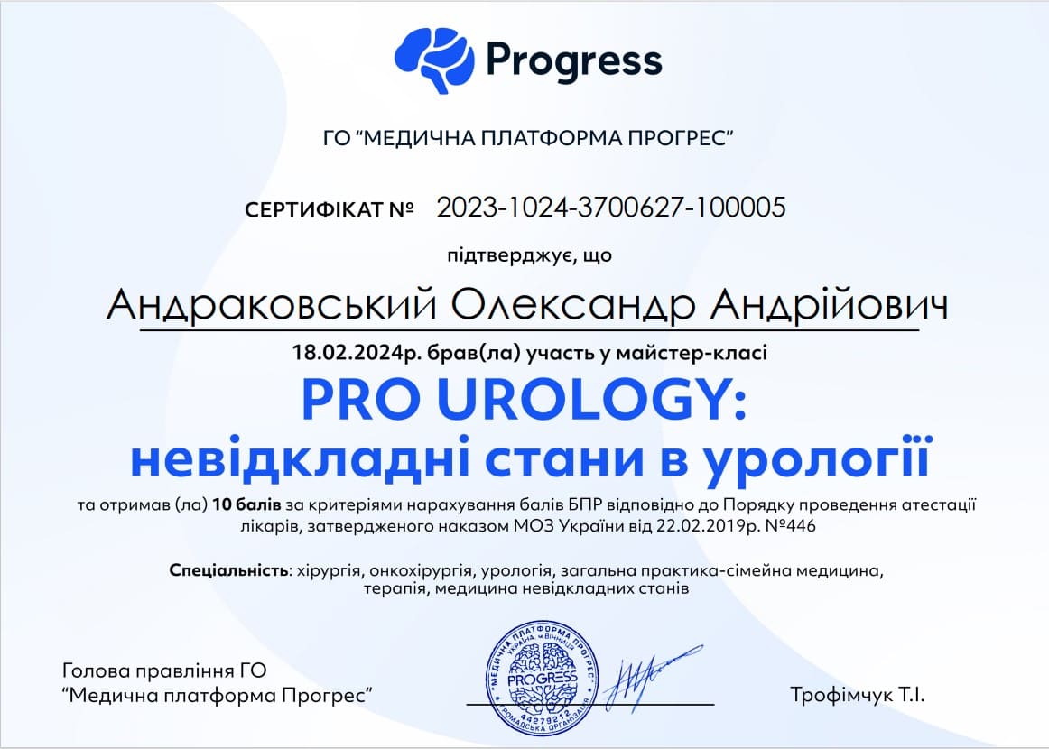- 2020 год – получил специализацию "Урология" (НМУ им. А.А. Богомольца).
