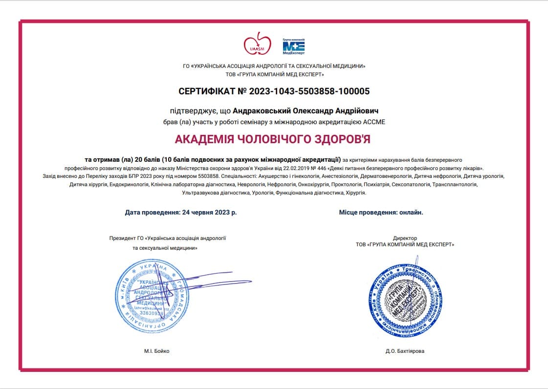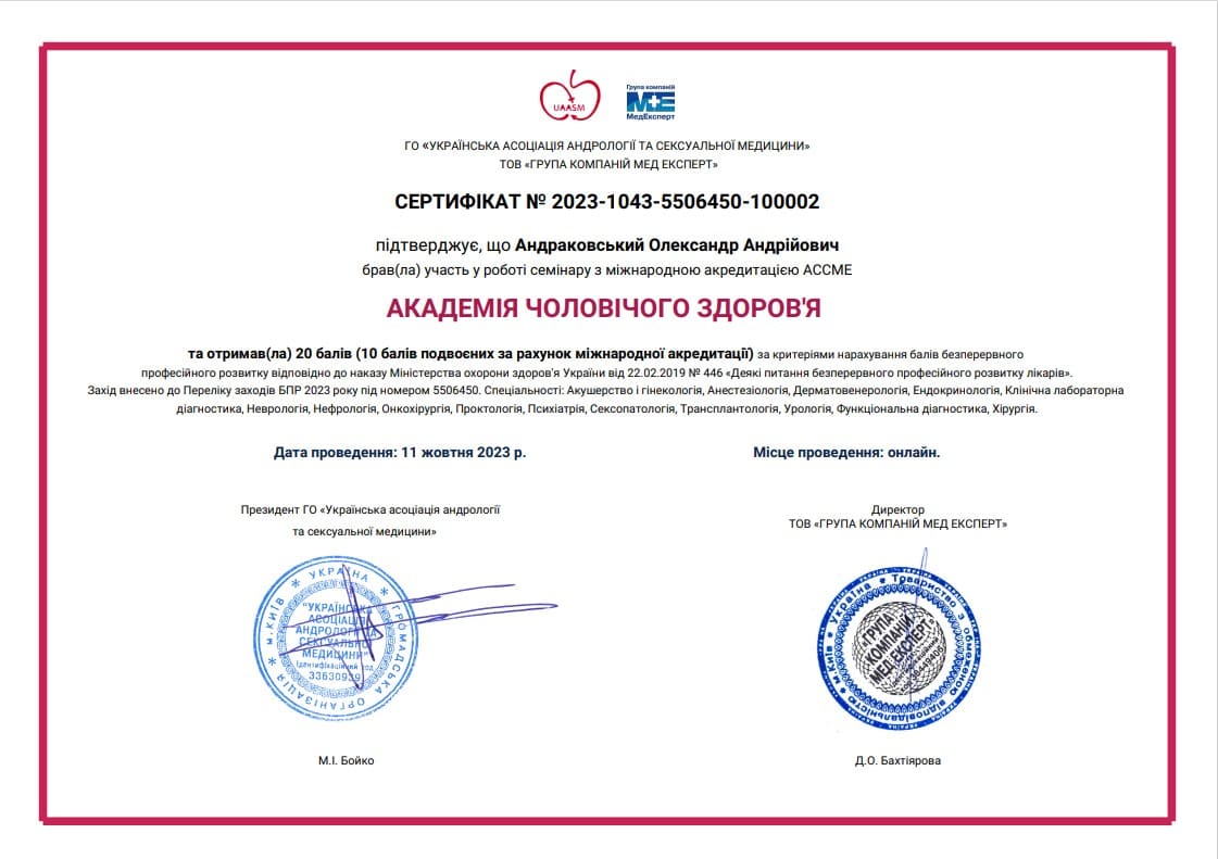 - 2022 год - ТУ "Актуальные вопросы сексологии и андрологии" (НУОЗ им. П.Л. Шупика).