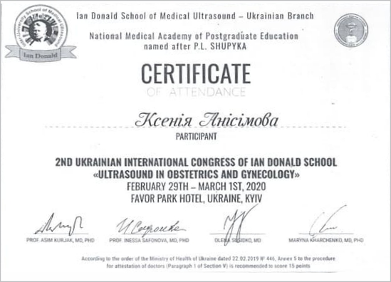 - 2020 год — участник ІІІ международного конгресса здоровья женщины «Репродуктивное здоровье женщины»;