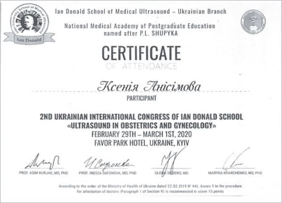 - 2020 год – участник онлайн-вебинара «Доплерометрия в акушерстве»;
