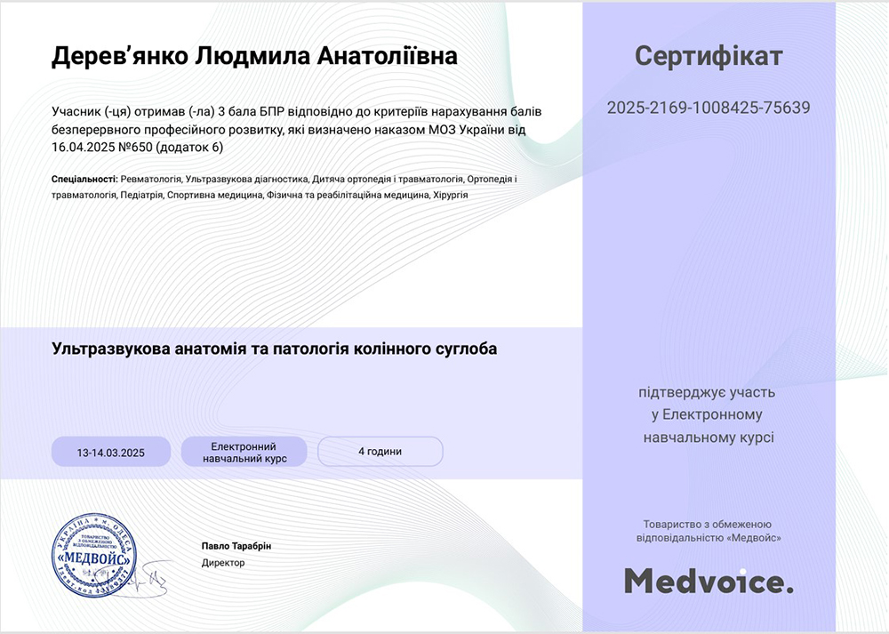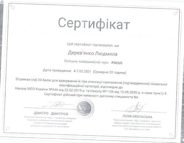 - 2017 — получила сертификат врача специалиста по ультразвуковой диагностике (НМАПО им. П. Шупика).