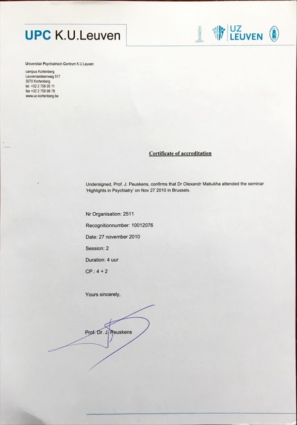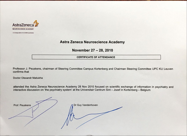 - 2010 год — повышение квалификации по психиатрии, центр Сент-Жозеф (Бельгия);