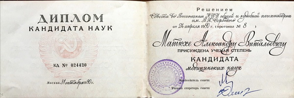 - 1988 год — аспирантура по специальности «Психиатрия», Киевский медицинский институт.