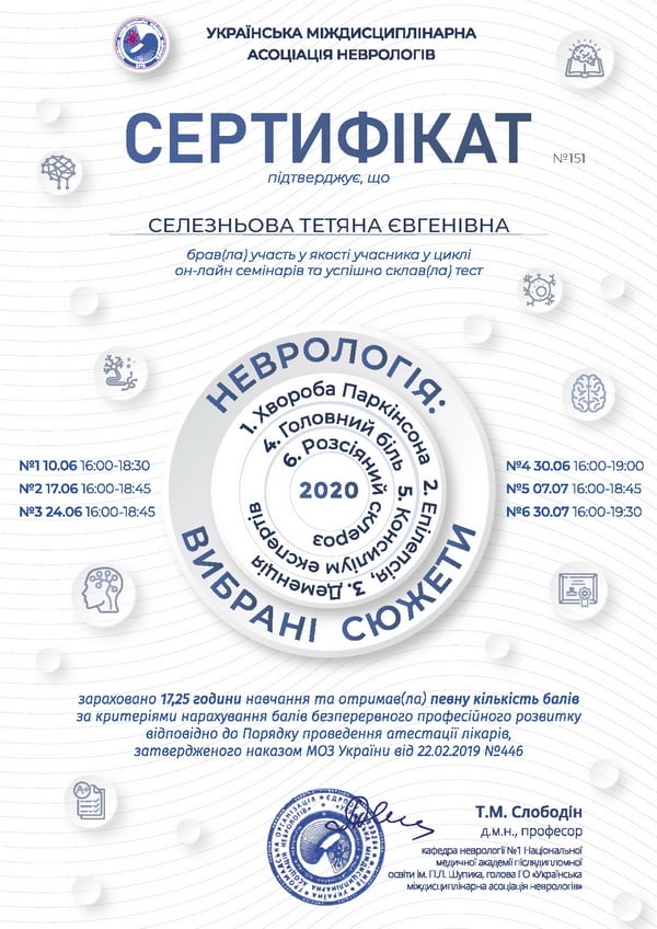 - 2020 год — Всеукраинская школа невролога — дистанционная форма обучения;