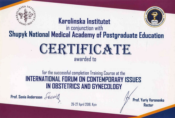 - 2023 год – «Сохранение беременности высокого риска» (НМАПО, г. Киев);