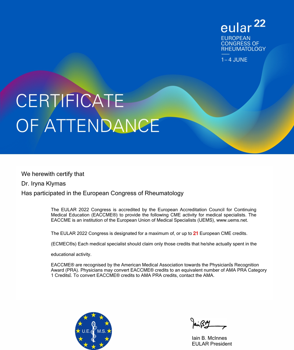 - 2022 год – ТУ "Актуальные вопросы ревматологии" (Национальный университет здравоохранения Украины имени П. Л. Шупика).