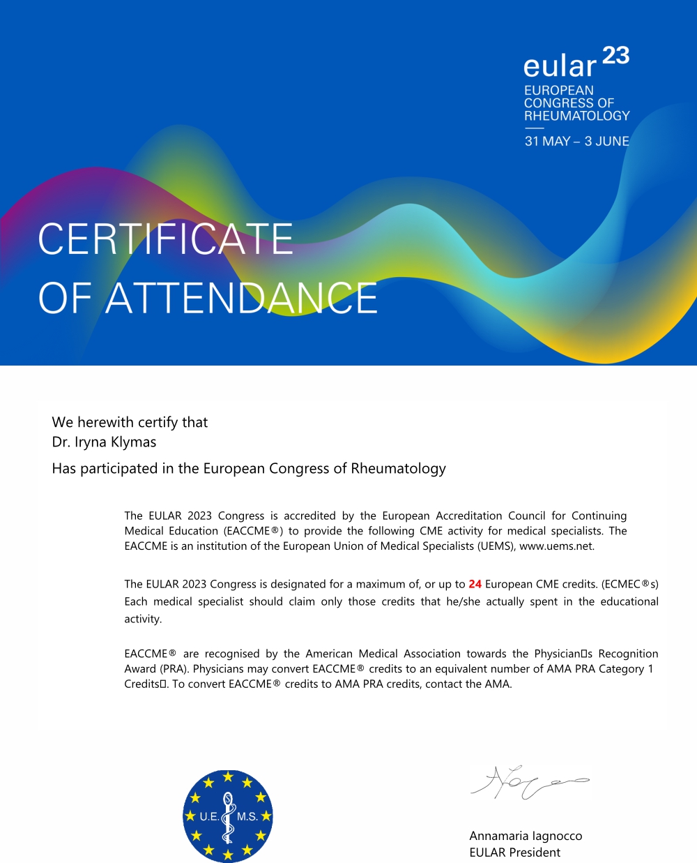 - 2024 год – ТУ "Актуальные вопросы ревматологии" (Национальный университет здравоохранения Украины имени П.Л. Шупика).
