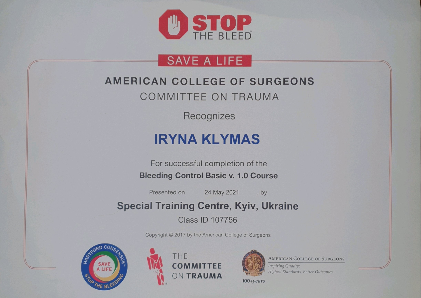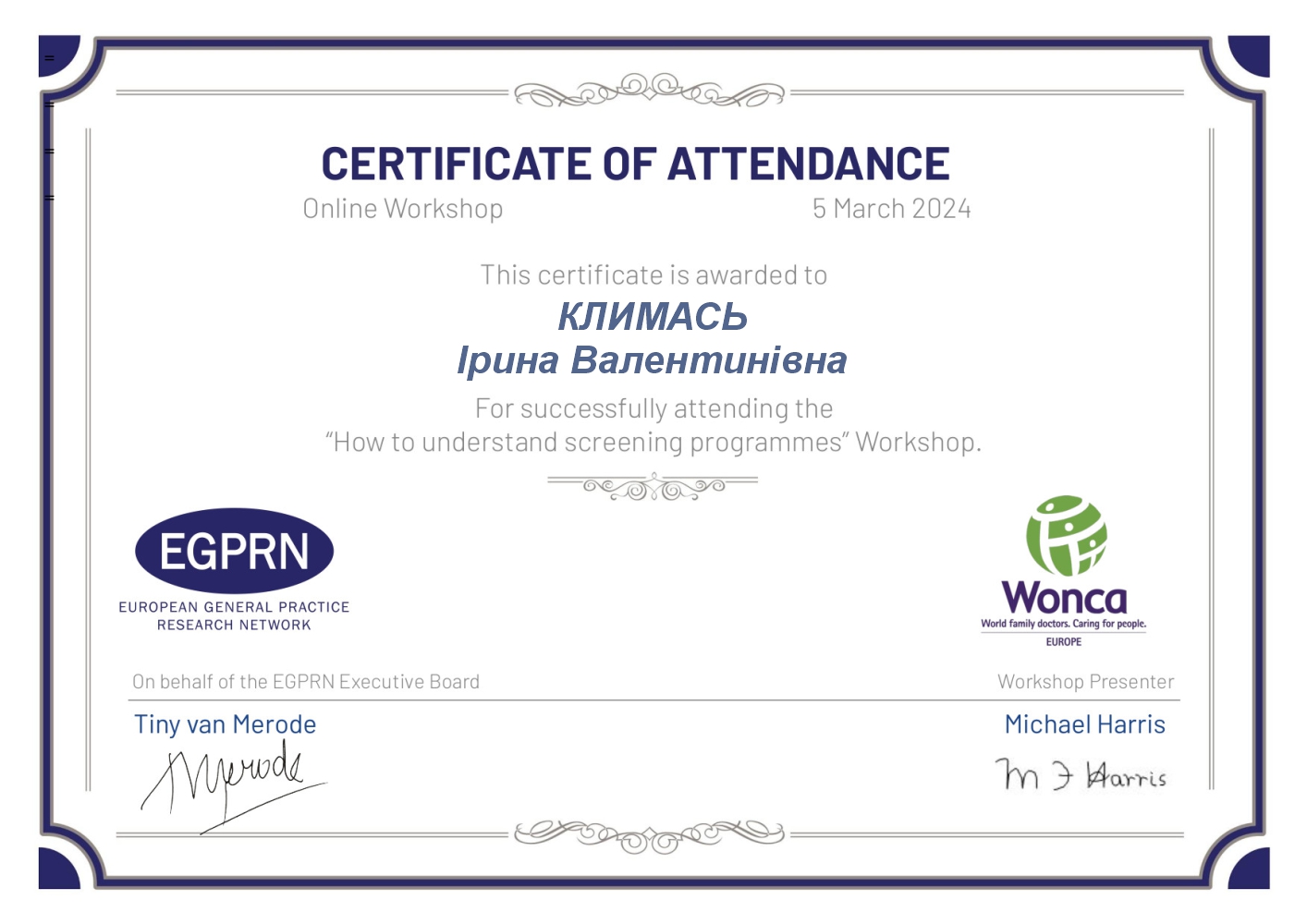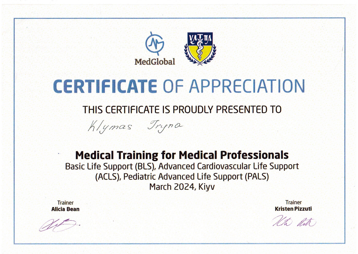 - 2023 год – ТУ "Актуальные вопросы терапии" (Национальный университет здравоохранения Украины имени П. Л. Шупика).