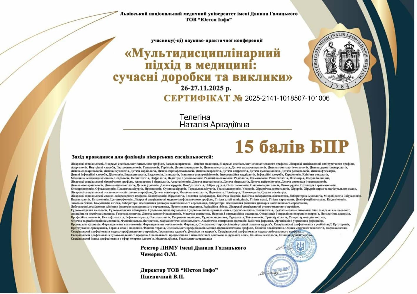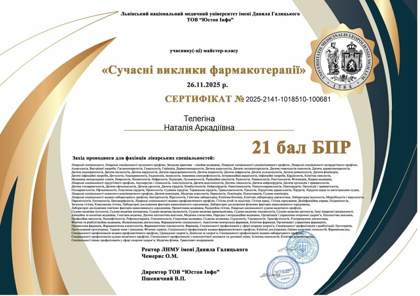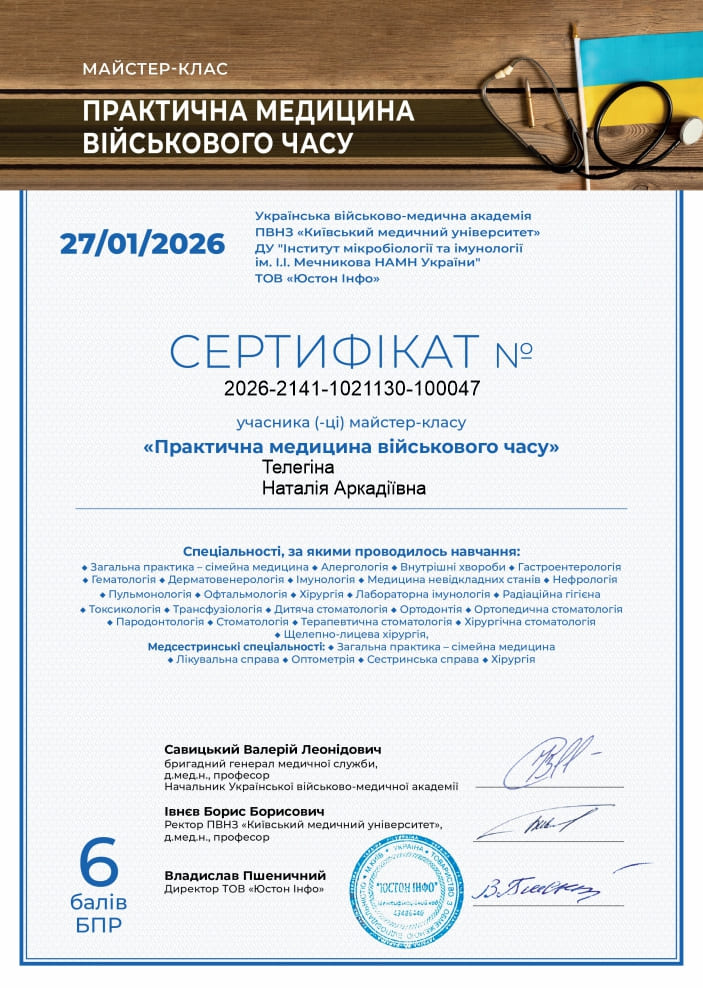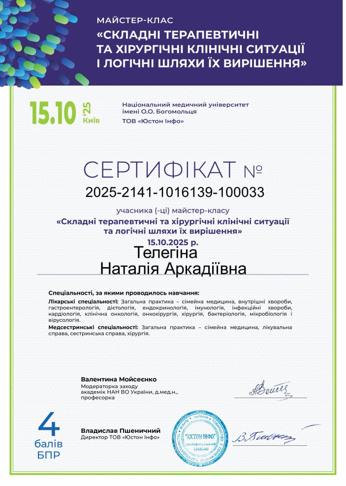 - 1992 год – окончила Национальный медицинский университет им. А.А. Богомольца по специальности «Лечебное дело».