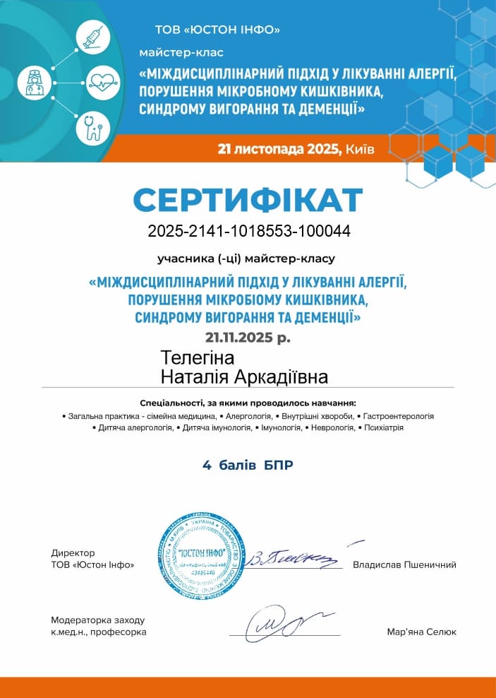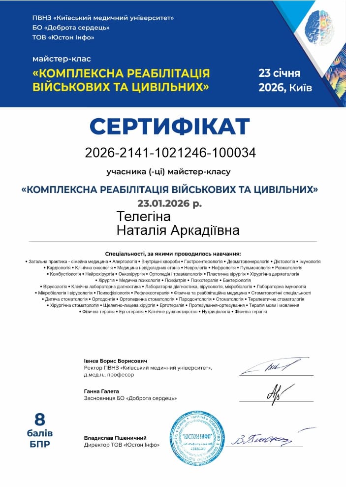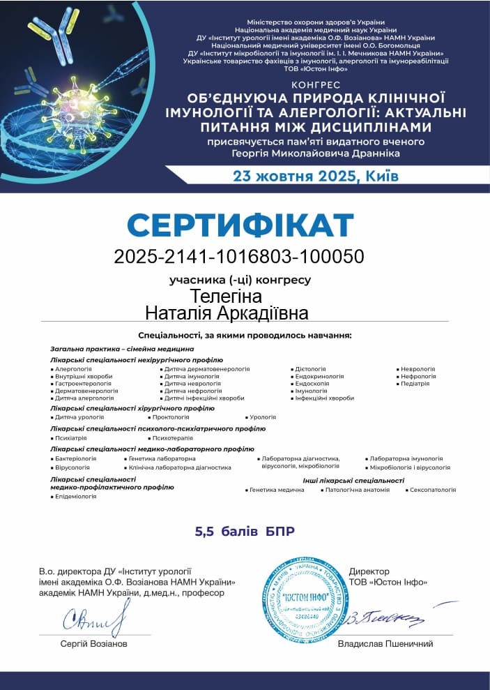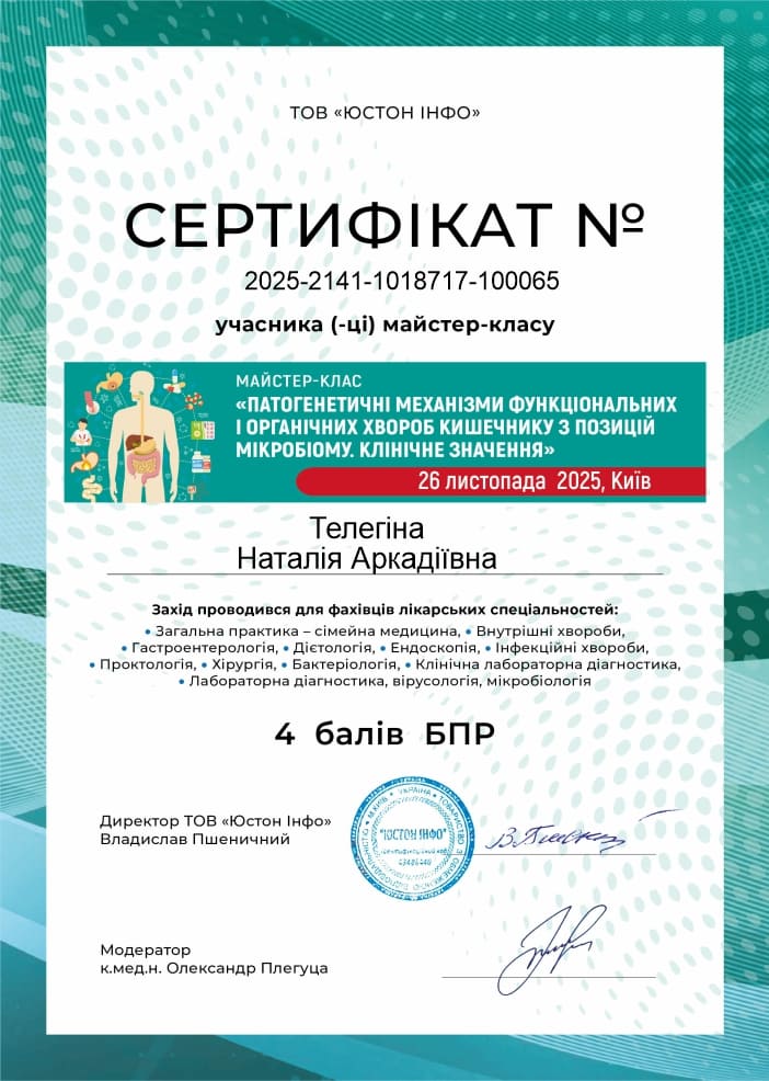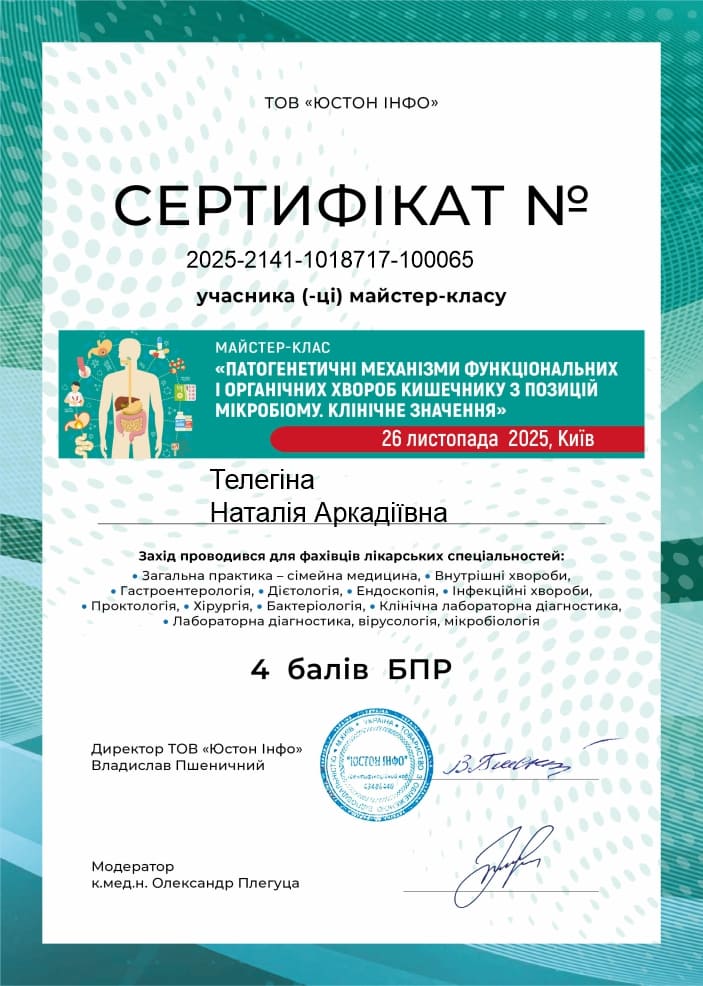 - 1992 год – окончила Национальный медицинский университет им. А.А. Богомольца по специальности «Лечебное дело».