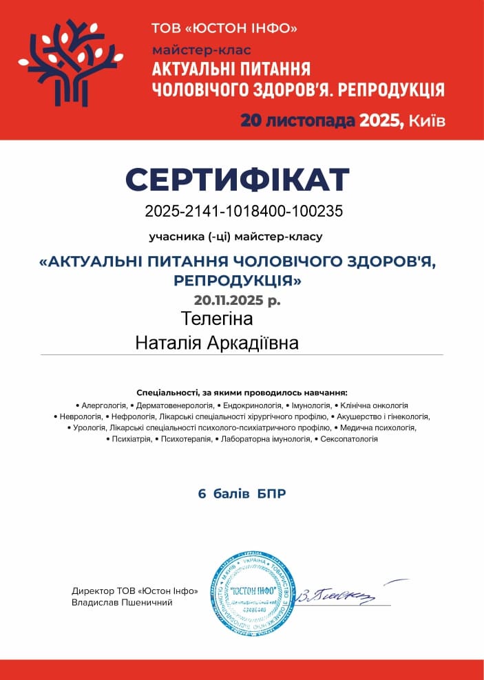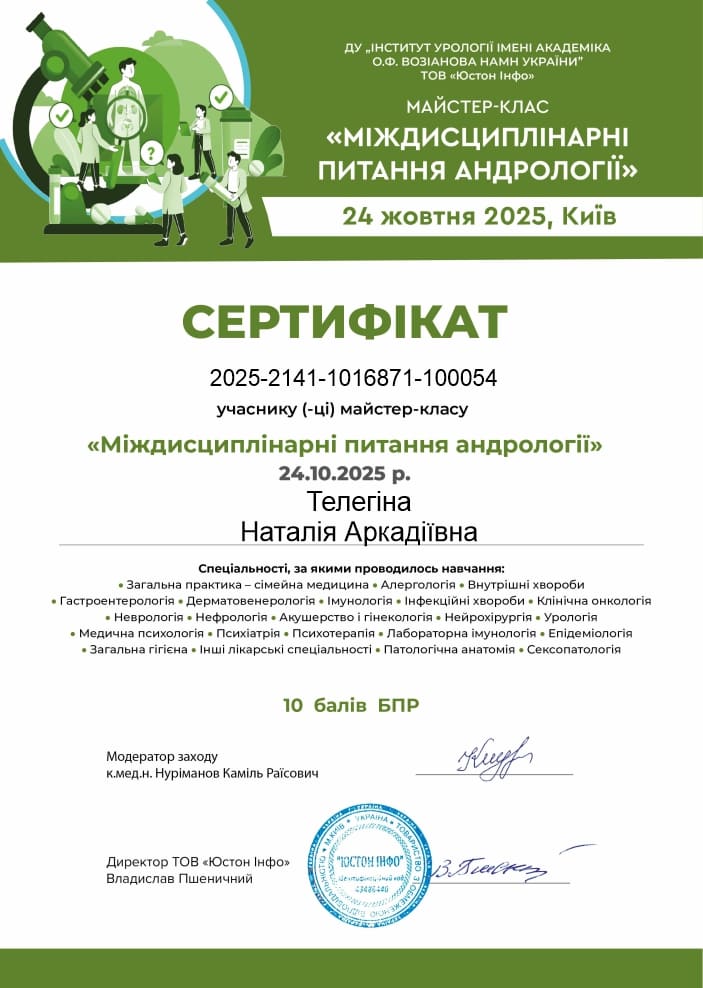 - 1995 год – интернатура по специальности «Отоларингология» на базе Украинского государственного медицинского университета.
