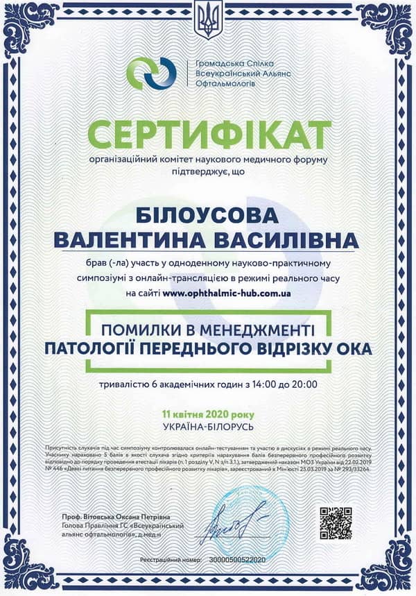 - 2018 год — получила специализацию «Офтальмология» (Национальная медицинская академия последипломного образования им. П.Л. Шупика).