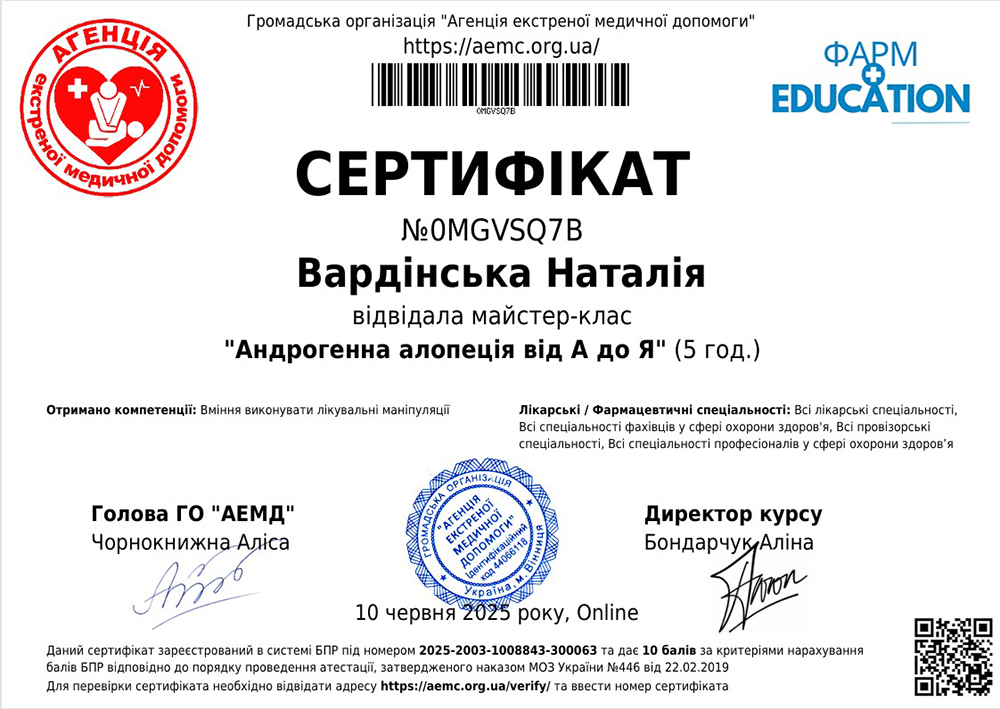 - 2020 год — участник профессиональных мастер-классов в онлайн формате (Первая Дерматотрихологичная Академия).