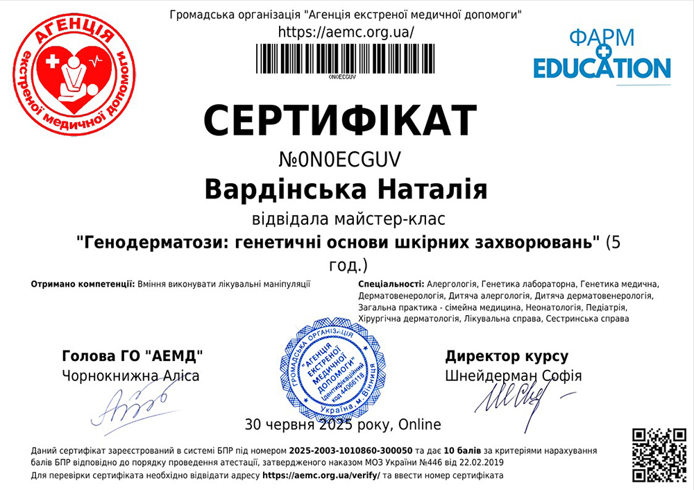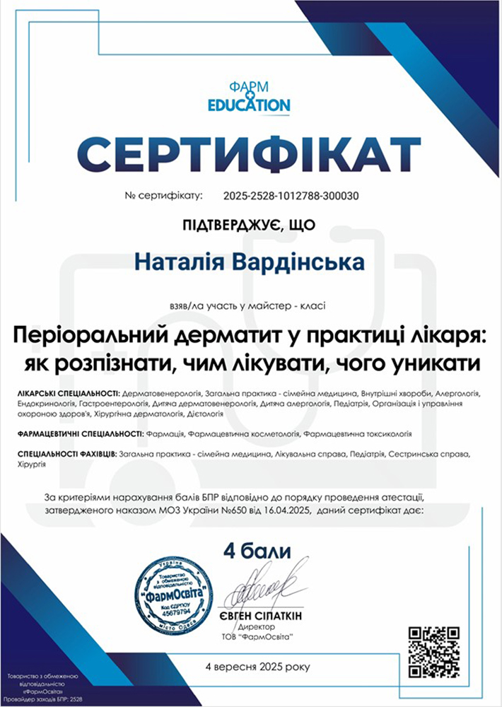 - 2013 год — интернатура по специальности «Дерматовенерология».