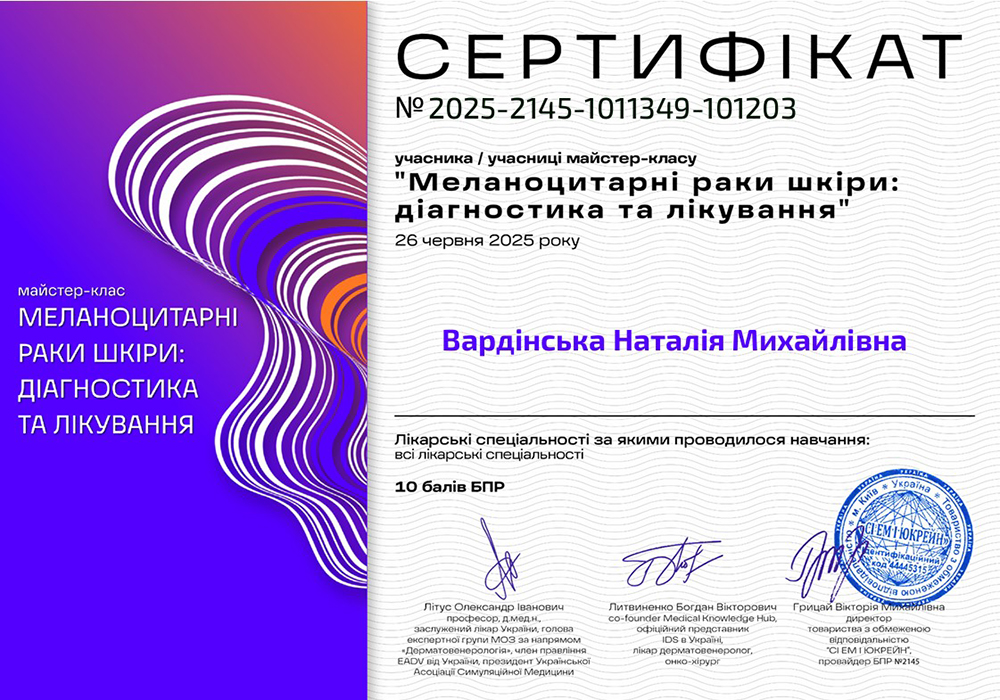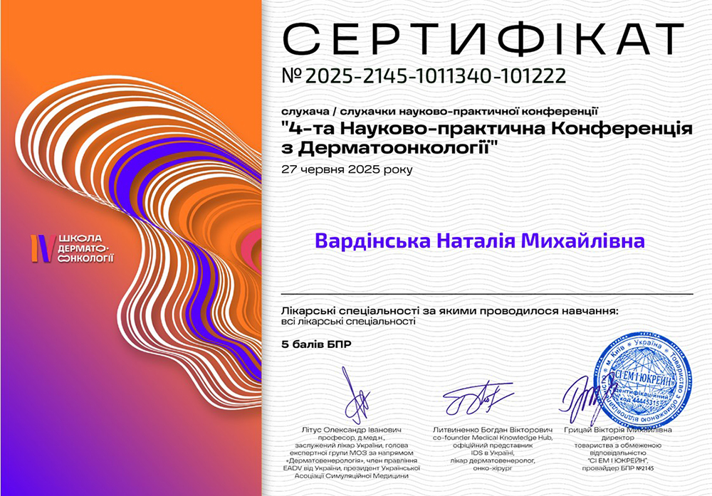 - 2020 год — участник «Melanoma days 2020 Online» (Украинское общество дерматоонкологии);