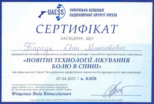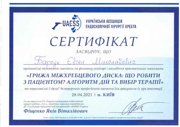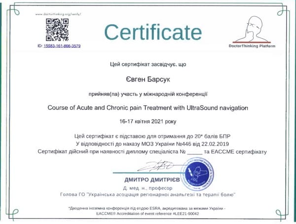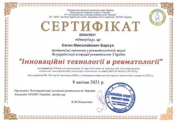 - 2020 год — дистанционный курс «Предоставление экстренной помощи при тяжелой острой респираторной вирусной инфекции» при Центре общественного здоровья МОЗ Украины.