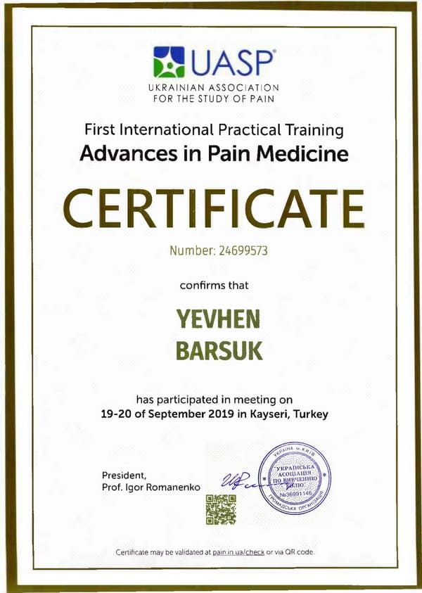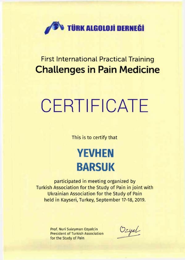 - 2019 год — Первый международный тренинг «Challenges in pain mediсine», г. Кайсери (Турция);
